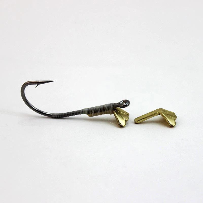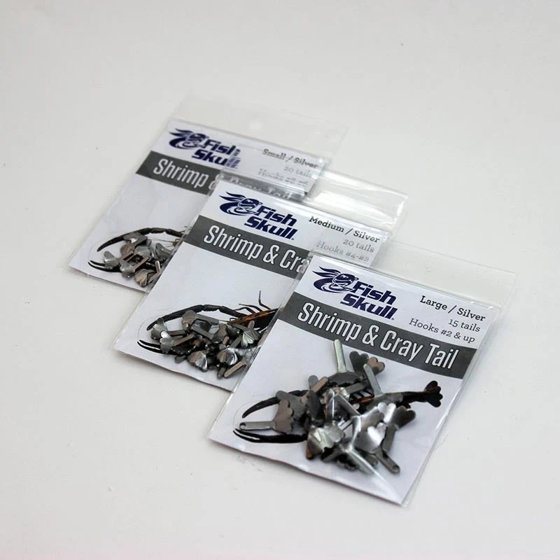Molded stainless steel crustacean-shaped tails. Add weight, tail profile and shine as well as enhancing action in the water; better than bead heads or bead chain. They’re effective for saltwater species from speckled trout and redfish to stripers, and warm freshwater from carp to bass. Small and medium have 20 per pack, large has 15 per pack.