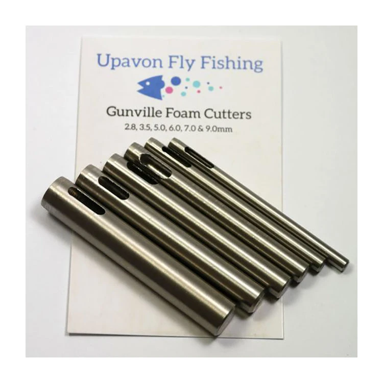 This Gunville foam cutter set provides a broad range of foam fly tying options and includes a full set of 6 sharpened stainless steel foam cylinder cutters in a wide range of sizes. Drill out your own Booby Eyes, Atomic Ants and fly bodies from a foam block. Pre-sharpened and manufactured from stainless steel, these tools are built to last. Cutters 57mm long with cutting depth of 45mm. For use in a drill. Made in the UK. Set of 6 sizes, 0.11 inch (2.8mm) to 0.35 inch (9mm) diameter.