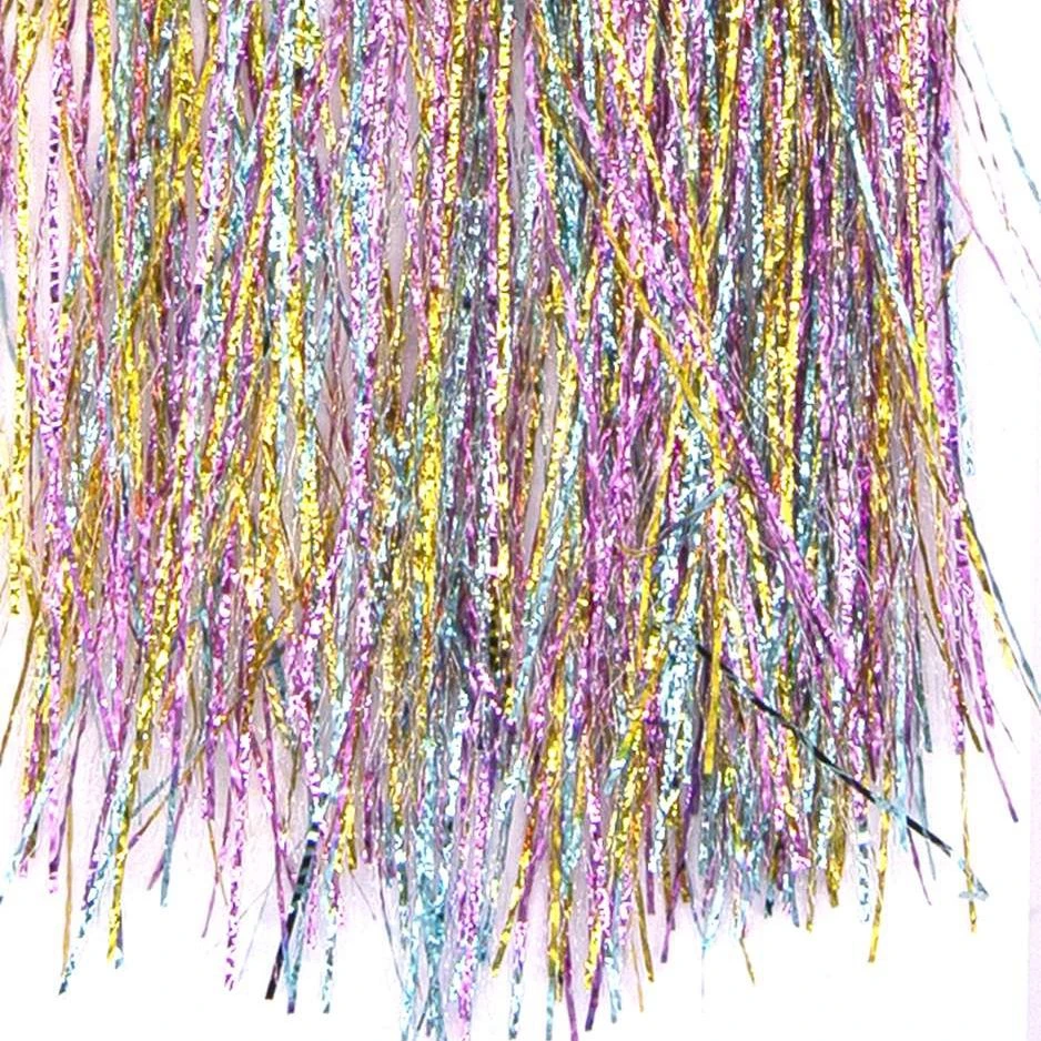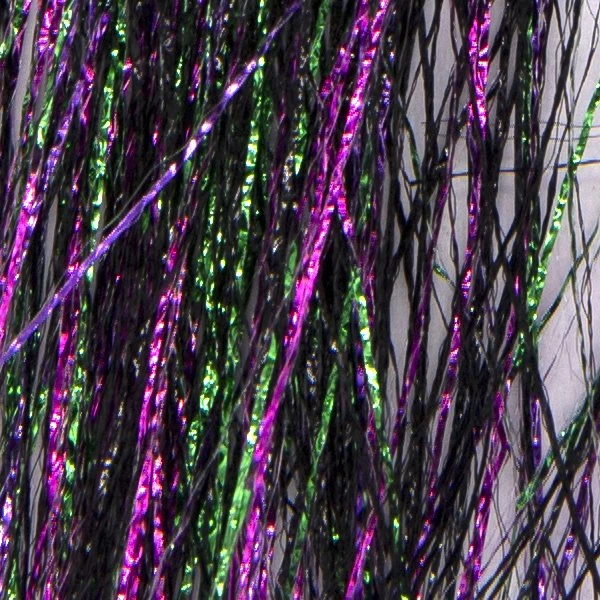SemperFlash Mixes are comprised of multi-colored strands of mylar which has been crimped to give the material texture and volume. Each strand contains alternating sections in 2 to 4 different colors, depending on the mix selected. The collective effect of the material’s movement in water is a kaleidoscope of those colors. This material can be used alone or in blends with solid-colored SemperFlash products, Krinkle Solid in particular. The strands are bound into a hank at one end, providing a 10-inch length of usable material – no cinching in the middle with a cable tie, which would render that part of the strand unusable. 300 strands per package.