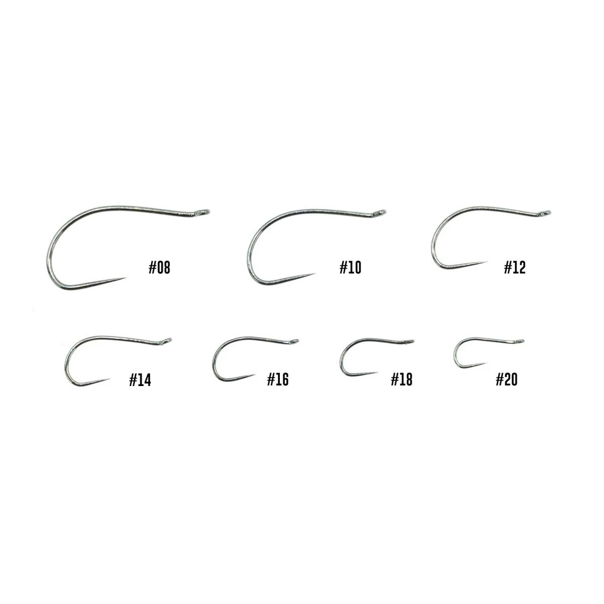The curved shank of the XC240 gives tyers a unique option for stonefly, caddis, shrimp, emergers, and many other styles of flies. The slightly upturned eye design ensures you won’t get in your own way of the hook point when tying a new creation, while the barbless point allows for easy hooking and releasing of fish. This hook is part of our XC competition hook collection designed to give anglers and tyers an unbeatable quality in a carefully crafted selection of shapes that hook and hold fish in stealthy black nickel barbless models. Sold in packs of 25. Slight up-eye, curved shank, X-wide gape, sproat bend, barbless point, black nickel finish.